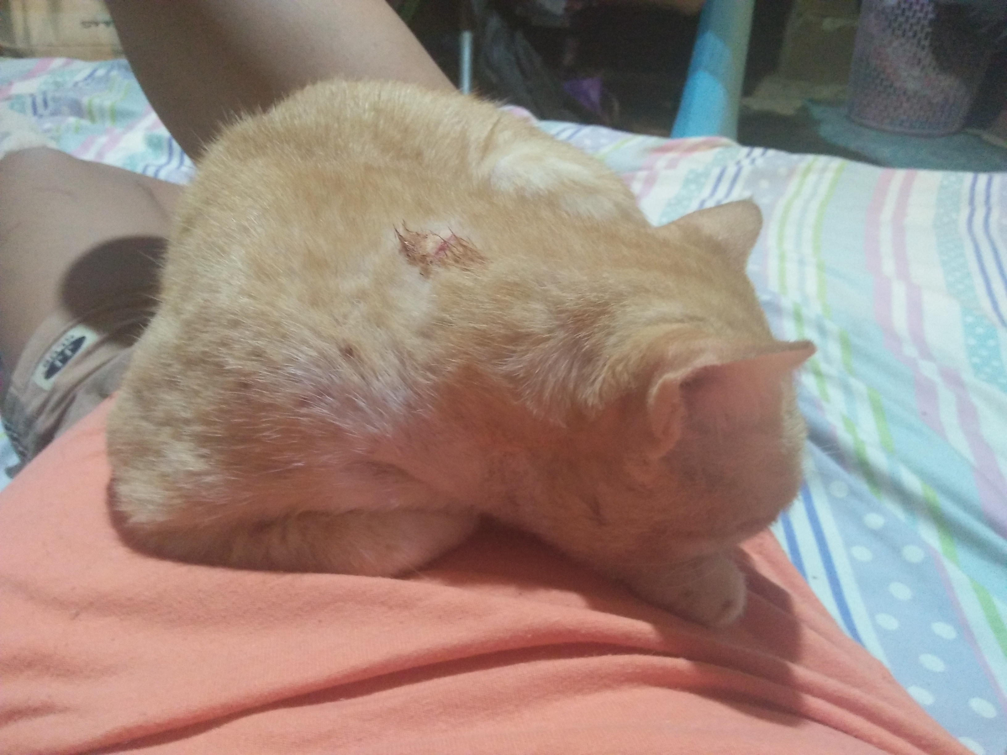 ไปบู๊กับใครมาก็ไม่รู้ กลับมานอนบนหน้าอกผมสบายใจเลย ได้ของฝากที่คอมาด้วย จับล้างแผลใส่ยาเรียบร้อบ แต่บางครั้ง ไม่เห็นรอยเขี้ยวที่โดนมา ไม่ตรงคอก็ใต้คาง จนบวมปูดเป็นลูกมะนาว ต้องใช้เข็มเจาะเอาหนองออก แล้วล้้างแผลทายา และกินยาแก้อักเสบ ไม่กี่วันก็หายดี ออกไปบู๊กับชาวบ้านเขาได้
