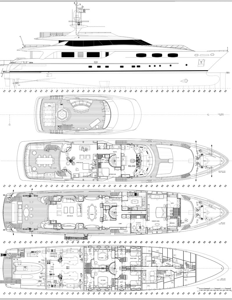 แบบในข้อนี้ จะแสดง รูปร่างหน้าตาของเรือ ด้านข้างขวา โดยหันหัวเรือไปทางขวามือ แปลนแต่ละชั้น ดังตัวอย่างด้านล่าง