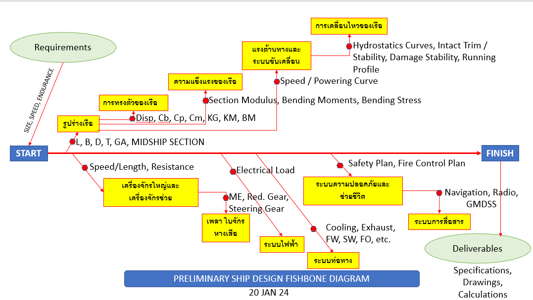 ภาพข้างบนเราเรียกว่า Fishbone Diagram หรือ ไดอแกรมแบบก้างปลาในภาษาไทย ส่วนบนเป็นเรื่องของการออกแบบตัวเรือ ส่วนล่างเป็นเรื่องของเครื่องจักร เพลาและใบจักร ฯ แต่จะบอกรายละเอียดเพิ่มเข้ามาว่า ถึงขั้นตอนไหนต้องทำอะไร คำนวนเรื่องอะไร ฯ ท่านใดสนใจก็ลองเอาไปศึกษาดูได้ตามขั้นตอนในภาพนี้ได้เลยครับ ทั้งสองภาพได้ถูกนำมาใช้กับนักศึกษาฝึกงาน ที่เรียนเกี่ยวกับการออกแบบเรือของ มหาวิทยาลัยแห่งหนึ่ง ในชั้นปีที่สามและสี่ครับ
