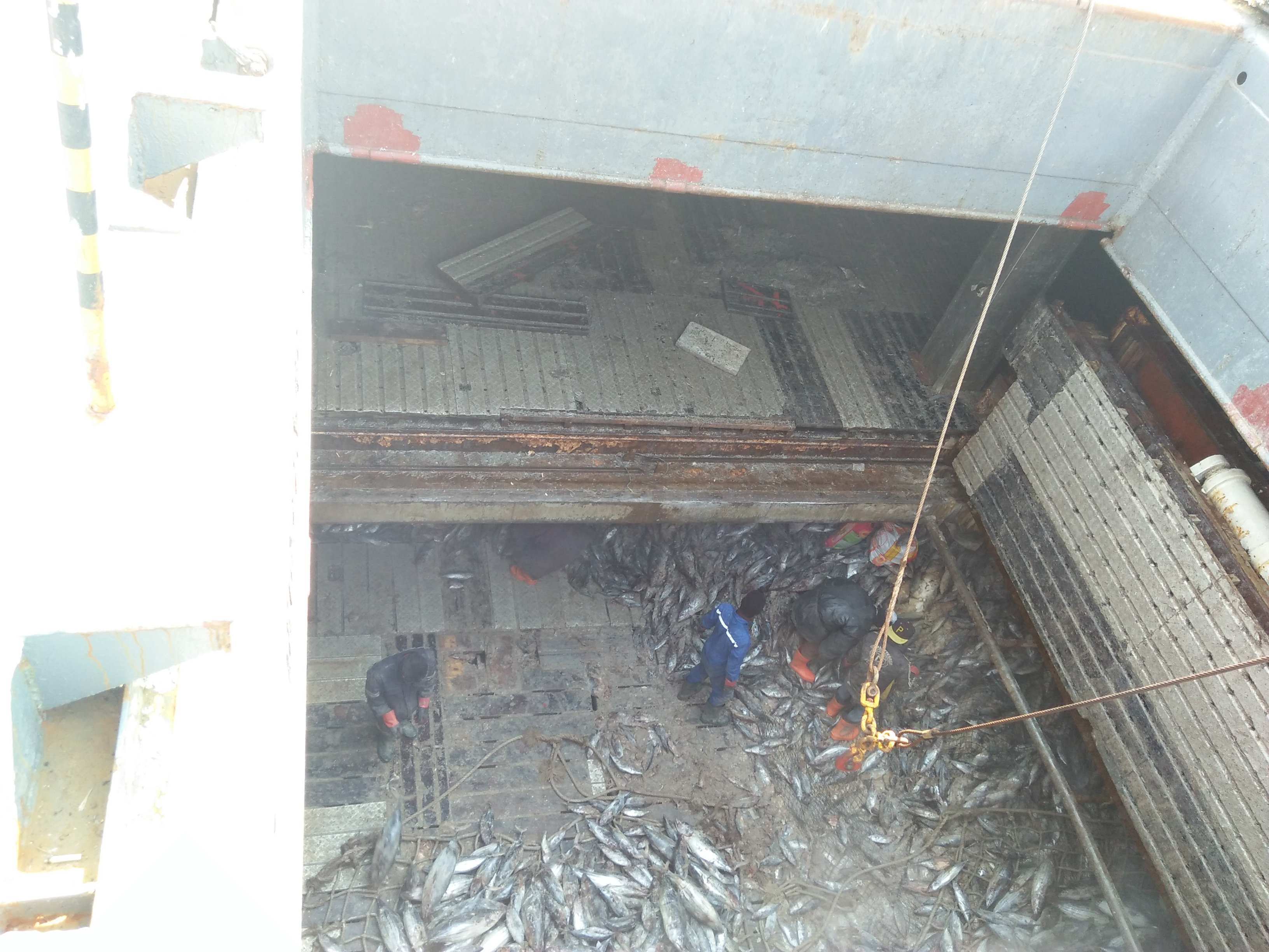 หายไปวันนึง มาต่อกันครับ ถ้าจำไม่ผิด เรือลำนี้ต่อที่ญี่ปุ่น เมื่อปี 1982......น่าจะประมาณนั้น เป็น การออกแบบและเทคโนโลยี่ทางด้านเรือเดินทะเลเมื่อสามสิบกว่าปีมาแล้ว ปัจจุบันก็ยังใช้งานได้อยู่ ลักษณะการใช้งานของเรือลำนี้ที่ได้ยินมา จับใจความได้ว่า เป็นเรือห้องเย็นที่คอยไปรับปลาจากเรือประมงกลางมหาสมุทรแปซิฟิค แล้วนำไปส่งยังท่าเรือต่างๆตามคำสั่งซื้อ หรือคำสั่งของเจ้าของเรือ บนเรือมีระวางบรรทุกเป็นห้องเย็นขนาดใหญ่สามห้อง แต่ละห้องมีสามชั้นดังรูป ดูจากห้องควบคุมเห็นว่าอุณหภูมิที่ใช้ในห้องเย็นอยุ่ที่ประมาณ -21 องศาซี.......ปลาที่อยู่ในนี้ก็คงแข็งเป็นก้อนหินดีๆนี่เองครับ