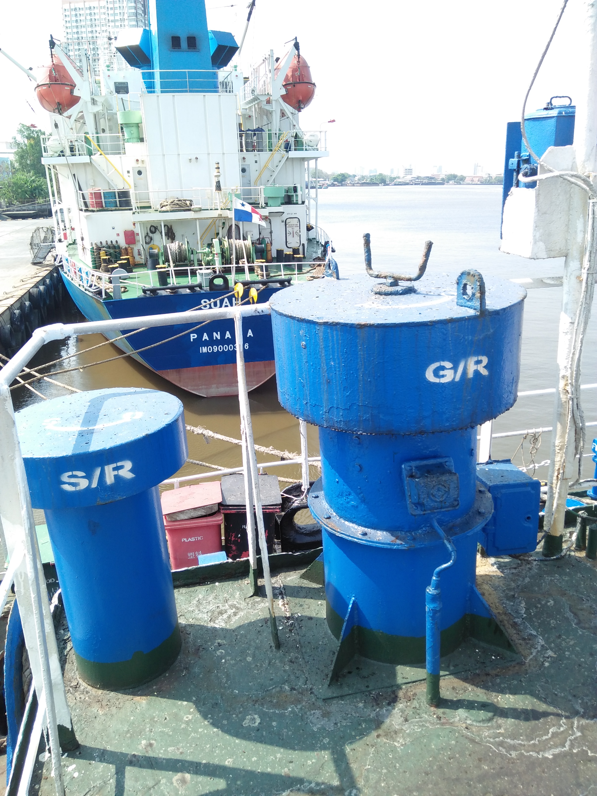 จากรูปข้างบน พอขึ้นไปบนเรือส่วนมากเราจะอยู่ที่ชั้น MAIN DECK นอกจากราวกันตกแล้วเราก็จะเห็น ท่ออย่างนี้ โผล่มาจากพื้น ใกล้ๆขอบของเรือ เป็นระยะ มันคือท่อระบายอาศของถังที่อยู่ภายในตัวเรือ มีสีฟ้าเขัม(ใช่สีฟ้านะ ผมเห็นเป็นสีฟ้า) มีตัวอักษรกำกับว่า FW หมายถึงเป็นท่อระบายกาศถังน้ำจืด ในรูปจะเป็นทั้งท่อระบายอากาศและเติมน้ำจืดครับ ส่วนกล่องสี่เหลี่ยม ที่มีตัวอักษร FW ก็คือตัวกันประกายไฟกระเด็นลงไป....ถังน้ำจืดติดไฟด้วย??? น้ำไม่ติดไฟแน่นอนครับ แต่ถังน้ำบางถัง ไม่ได้เปิดเป็นเวลานานๆเข้ามันจะเกิดการสะสมของแก๊สซึ่งแก๊สที่เกิดนั้นไม่แน่นอนเสมอไป บางตัวอาจติดไฟได้ เขาก็เลยกันไวก่อนครับ แล้วประกายไฟจะมาจากไหน ก็จากคนสูบบุหรี่มั่ง จากการเชื่อม ,ขัด เหรือตัดเหล็กตอนซ่อมบำรุงบริเวณใกล้เคียง หรือจากไฟฟ้าสถิตย์ ก็แล้วแต่ดวงครับ กันไว้ก่อนดีที่สุด