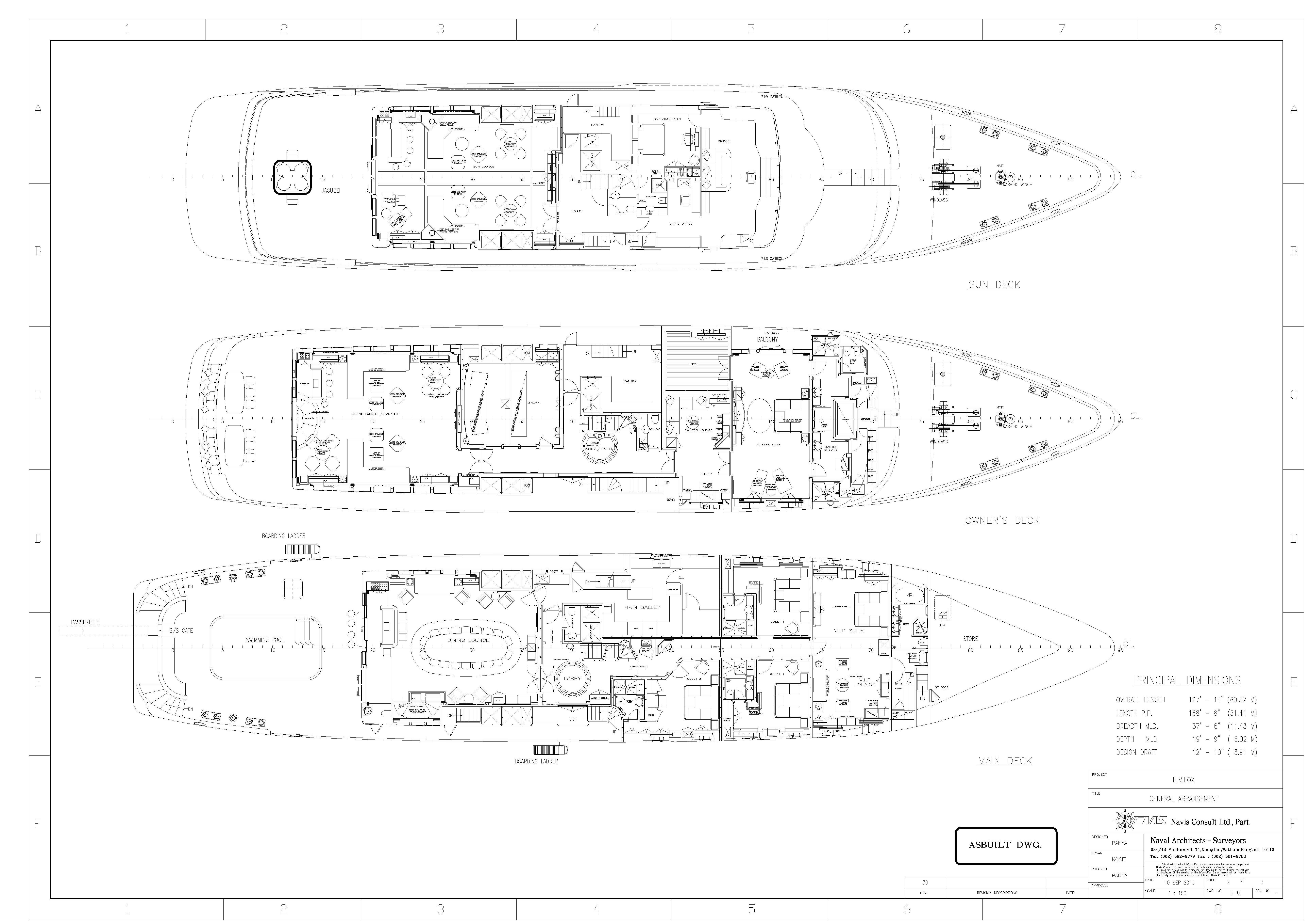 เรามาเริ่มที่เส้น L.W.L. กันก่อน เส้นนี้ในภาพหมายถึงระดับน้ำที่เรือลอยอยู่ สูงขึ้นมาก็เป็น MAIN DECK ถัดขึ้นไปก็เป็น UPPER DECK หรือ NAVIGATIO DECK หรือ WHEEL HOUSE หรือสะพานเดินเรือเพราะเป็นที่ตั้งของห้องที่ใช้บังคับเรือลำนี้ และชั้นสุดท้ายก็เป็นหลังคา หร์อ SKY DECK ระหว่างชั้นต่างๆมีตัวเลขกำหนดความสูงไว้ คือประมาณ 2.20-2.50 เมตร จะต่ำหรือสูงกว่านี้ก็ได้ครับ แล้วแต่การออกแบบและกำลังเงิน แต่เท่าที่เห็นๆมาส่วนใหญ่ก็อยู่ในระยะนี้ ต่อมาก็เป็นชั้นที่ต่ำกว่า MAIN DECK คือ LOWER DECK ถัดลงมาก็คือท้องเรือหรือ BUTTOM ระยะจาก MAIN DECK ถึง LOWER DECK ก็เหมือนกันครับ 2.20-2.50 เมตร แต่ค่ำลงมาถึงท้องเรือ ระยะนี้ไม่ตายตัวครับ เพราะส่วนใหญ่จะใช้เป็นถังเก็บน้ำมันเชื้อเพลิง ถังน้ำจืด หรือถังน้ำถ่วงเรือ(ballast tank)ถ้าเรือลำไม่ใหญ่มาก ระยะนี้อาจจะแค่ 1.00-1.50 เมตร หรือต่ำกว่านั้น ขนาดของหน้าต่างนี่เอาตามสบายเลยครับที่ระดับเหนือ MAIN DECK ขึ้นไป แต่ถ้าต่ำลงมา ความกว้างก็ไม่ควรจะเกินระยะของ เฟรม หรือ กงเรือ ครับ เพราะไม่งั้นต้องเสริมโครงสร้างกันอีกเยอะเลย ส่วนเส้นบอกระยะที่มีเครื่องหมาย ? ก็หมายความว่า ใส่เอาตามสะดวกเลยครับอยากจะให้กว้าง ยาว เท่าไร ถ้านึกไม่ออก ก็เอาตัวเราเป็นหลัก เดิน นอน นั่ง สบาย ไม่ติดขัด ห้องที่จะใช้ทำกิจกรรมต่างๆ ก็ลองออกแบบ ใส่ลงไปตามที่อยากได้ อ้ออีกเรื่องนึง คือ เมื่อมองจากด้านบน ลำตัวเรือทั้งสองด้านซ้าย ขวา มันเท่ากัน แต่ การจัดวางห้องต่างๆภายในและบนตัวเรือ ไม่จำเป็นจะต้องแบ่งห้องซ้าย ขวาเท่ากันนะครับ